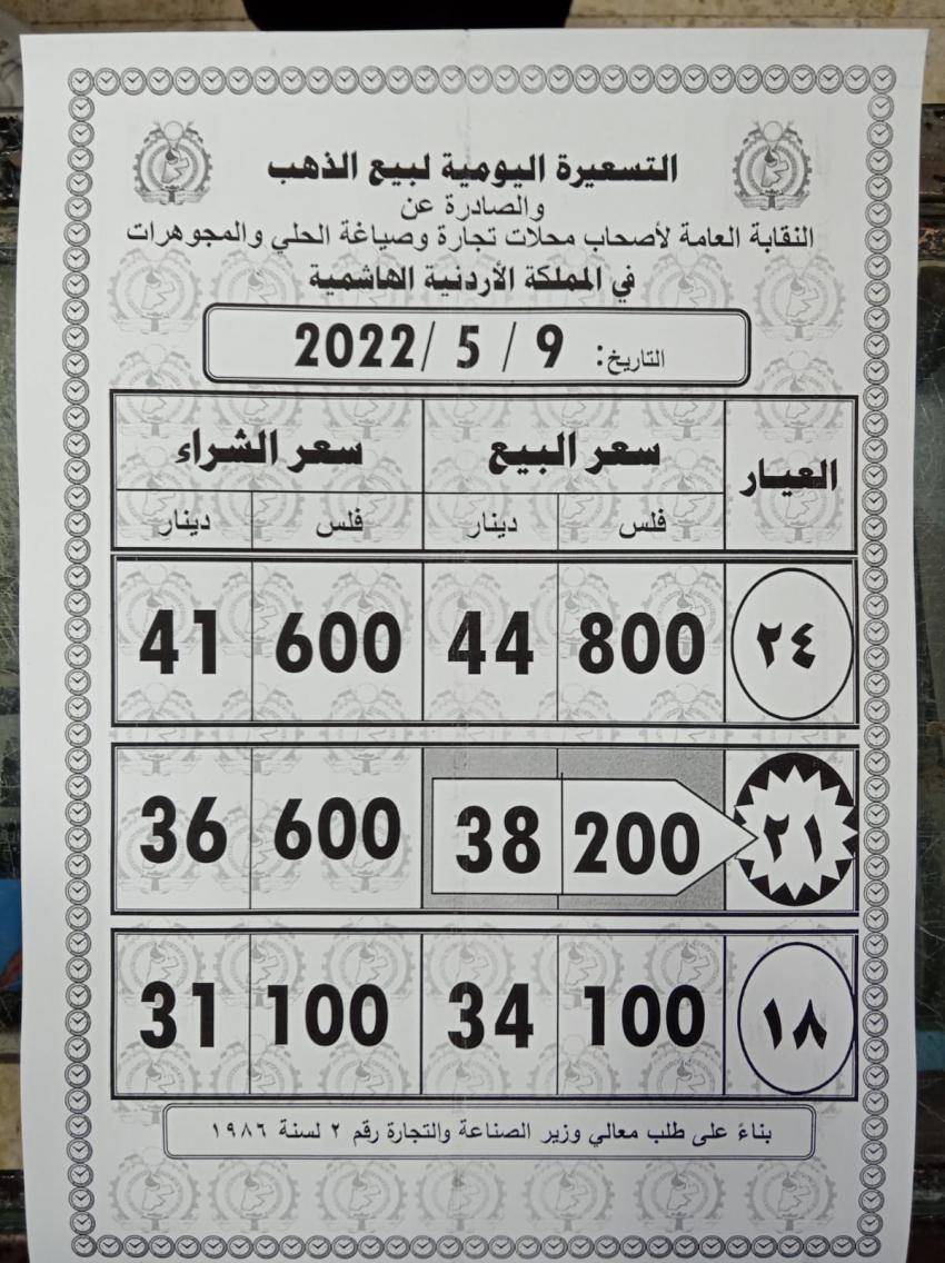 انخفضت أسعار الذهب في السوق المحلي الأردني اليوم الاثنين 20 قرشا، وفق التسعيرة الصادرة عن النقابة العامة لاصحاب محلات تججارة وصياغة الحلي والمجوهرات.