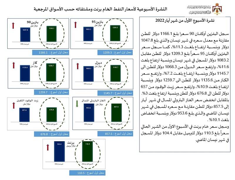 قالت وزارة الطاقة والثروة المعدنية، اليوم الاثنين، وعبر النشرة الأسبوعية لأسعار المحروقات والتي تصدرها الوزارة إن أسعار المحروقات ارتفعت عالميا.