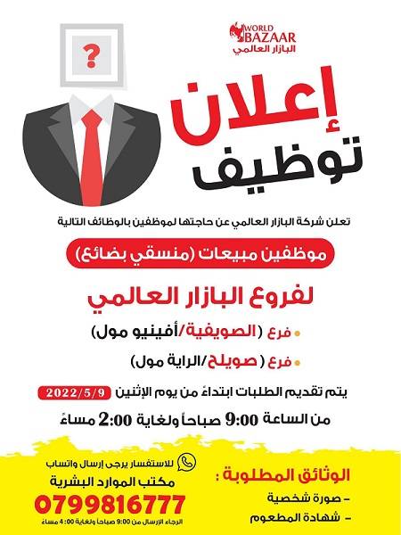 أعلنت شركة البازار العالمي عن حاجتها لموظفين مبيعات (منسقي بضائع).