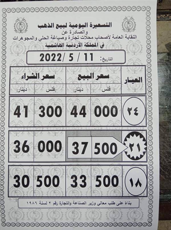 ويشمل التقريــر أسعار المعدن عيارات ( 24، 21، 18) ، كونها الأكثر تداولا في الأردن.