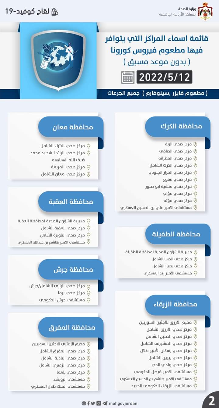 أعلنت وزارة الصحة عن قائمة اسماء المراكز التي يتوافر فيها مطعوم فيروس كورونا (بدون موعد مسبق) #جميع_الجرعات ليوم الخميس 2022/5/12 :
