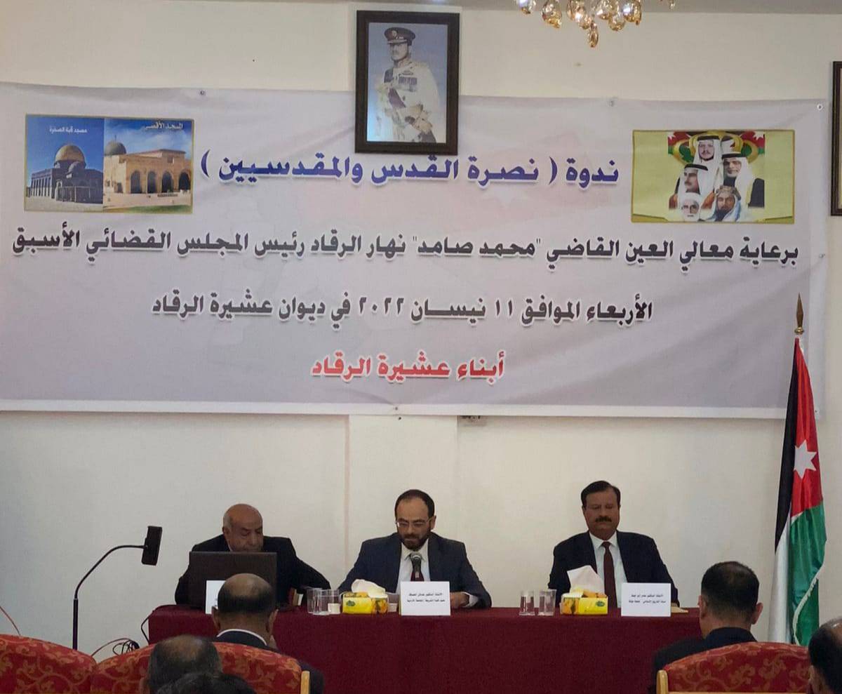 أقامت عشيرة الرقاد مساء يوم الأربعاء الموافق 11 أيار 2022م ندوة في ديوان العشيرة بعنوان       " نصرة للقدس والمقدسيين " برعاية معالي العين القاضي "محمد صامد" نهار الرقاد رئيس المجلس القضائي الأسبق ، وذلك بهدف إبراز أهمية القدس الدينية والتاريخية ، وإلقاء مزيد من الضوء على مكانتها في النبض السياسي الهاشمي مذ عام 1916 – 2022 ، منذ ثورة الشريف الحسين بن علي وعبر العهود الهاشمية الأربعة وصولاً إلى عهد جلالة الملك المعزز عبدالله الثاني ابن الحسين ، وبيان أهمية ووجوب الوقوف إلى جانب الأشقاء الفلسطينيين بعامة والمقدسيين بخاصة ، حيث يواجهون الآن بكل شجاعة وثبات هجمات المستوطنيين المتطرفين على الحرم القدسي الشريف بحماية قوات الاحتلال الإسرائيلي التي ترمي إلى فرض واقع جديد على المدينة المقدسة وعلى الحرم القدسي الشريف بحجج واهية لا تستند إلى أي شكل من أشكال الحقائق الدينية أوالتاريخية  .وقد شارك في الندوة أساتذة من الجامعات الأردنية وضباط متقاعدون من القوات المسلحة لأردنية /الجيش العربي ، حيث قدم الأستاذ الدكتور عدنان العساف عميد كلية الشريعة في الجامعة الأردنية ورقة بعنوان : " أهمية ومكانة القدس الدينية " قال فيها : إن هذه الندوة والتي قام أبناء عشيرة الرقاد بتنظيمها، بالغة في الأهمية والأثر، إذ تنظم في هذا الوقت الحساس، نصرة لقدس الأقداس ولإخوتنا المقدسيين الصامدين الأحرار، لتعلن للجميع بأننا معهم ونشد أزرهم على طريق الخير والصمود، وقد بين العساف أهمية القدس ومكانتها الدينية والتي ترجع لبداية تاريخ البشرية، فهي مدينة الإيمان والهدى لجميع بني الانسان، وهي بوابة السماء التي أسري إليها بسيدنا محمد صلى الله عليه وسلم،  فأمّ بالأنبياء والملائكة، ومنها عرج إلى السماء، والذي يعلمنا دروساً في التدبر والتفكر بعظمة الكون، وهو كتاب الخلق، والذي يقربنا من ربنا الخالق العظيم، ويوثق علاقتنا ببارئنا العظيم،  وبالنبوة والرسالات، والتي آخي بها إلى الأنبياء والمرسلين إخراجا للناس من الظلمات إلى النور، وهداية لهم للتوحيد والاستقامة، وقد صلّى نببُنا عليه السلام  بالأنبياء والملائكة جماعة في القدس، ونزلت عليه آية من القرآن فيها، وقد خيّره جبريل عليه السلام وهو فيها بين شرب الخمر أو اللبن، فاختار الفطرة فشرب اللبن في مدينة الفطرة والطهارة، وفي هذا توجيه لوجوب المحافظة على نقاء السريرة والسمو بالكرامة الإنسانية، والارتقاء بالخلق والسلوك،.