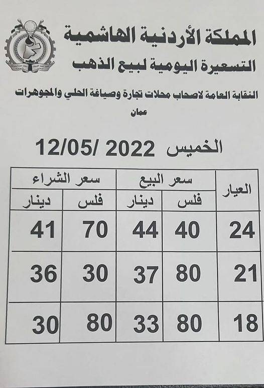 ووفق نقابة أصحاب محلات تجارة وصياغة الحلي والمجوهرات، فقد بلغ سعر بيع غرام الذهب عيار 21 الأكثر رغبة من الأردنيين بالسوق المحلية عند 37,80 دينارا لغايات شراء المواطنين من محلات الصاغة.
