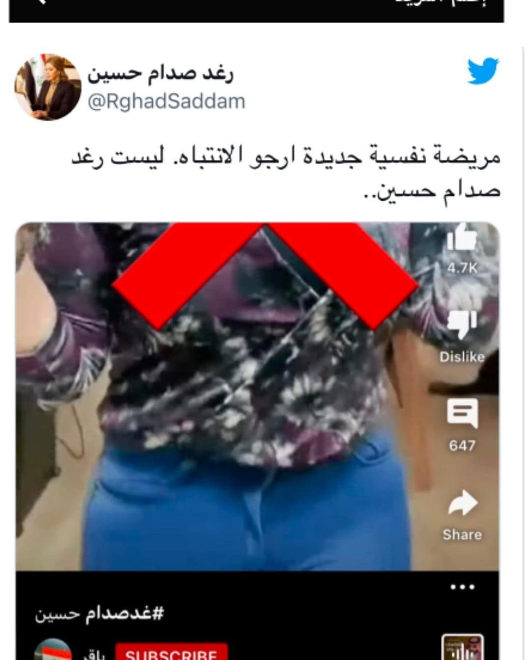 وقالت رغد في تغريدة عبر صفحتها على موقع التواصل الاجتماعي "تويتر" بعد انتشار حساب على تيك توك يحمل اسمها : مريضة نفسية جديدة ارجو الانتباه. ليست رغد صدام حسين.
