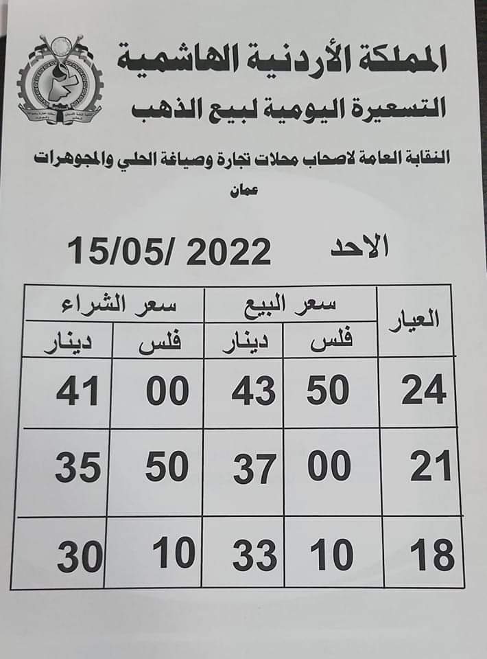 ويشمل التقريــر أسعار المعدن عيارات ( 24، 21، 18) ، كونها الأكثر تداولا في الأردن.