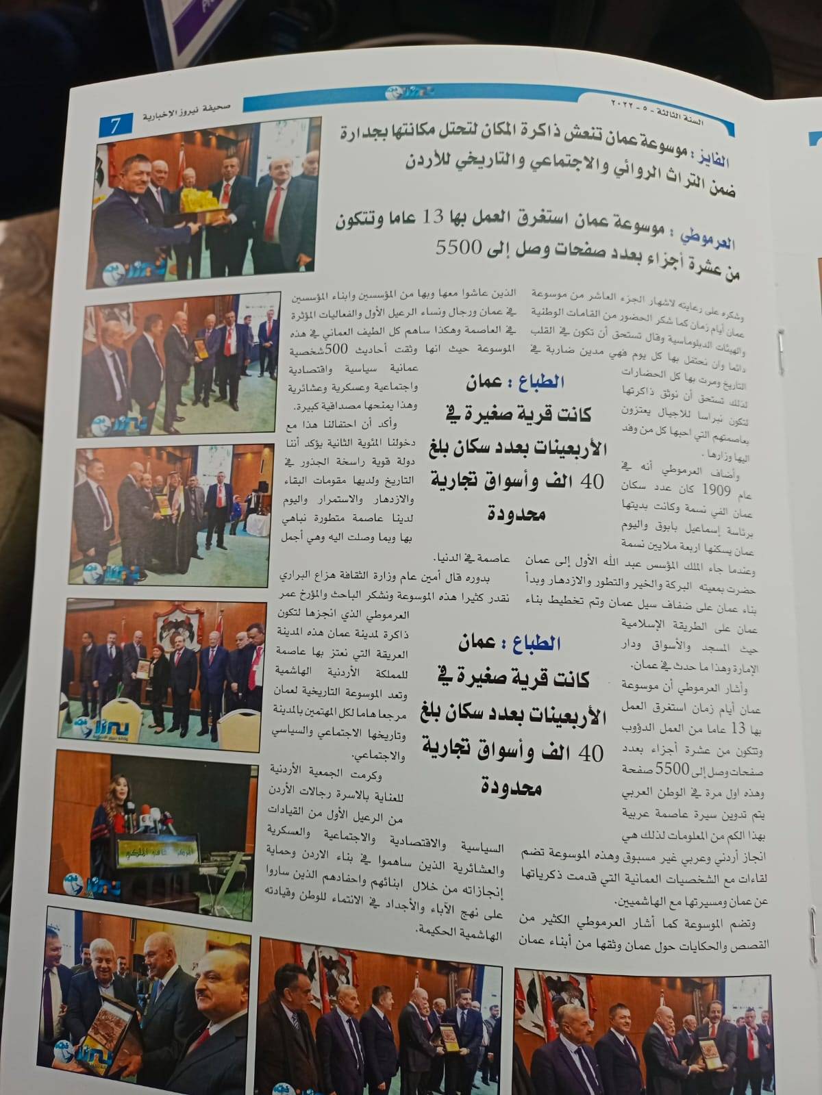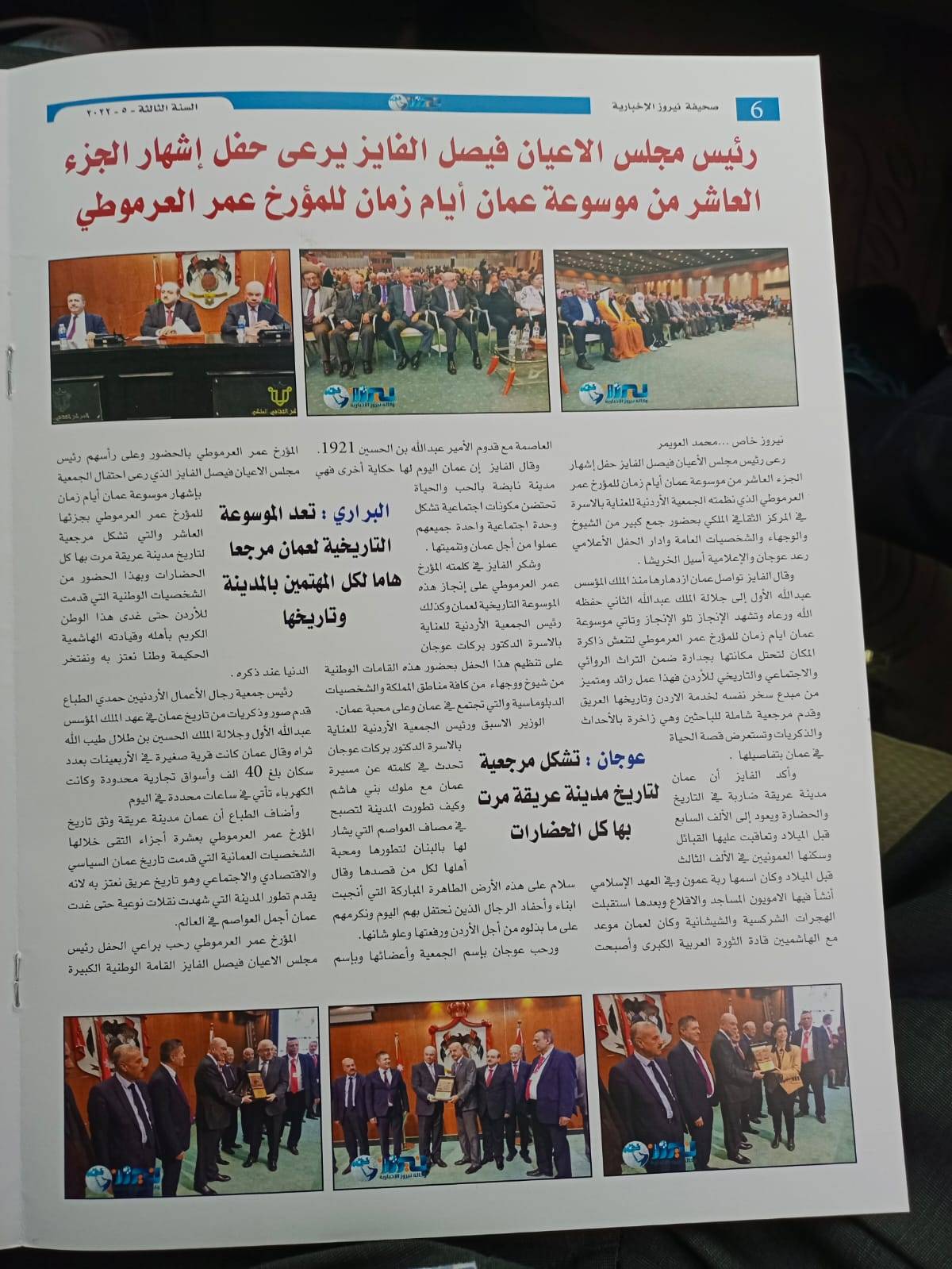 وكما تحدثت المطبوعة عن رعاية رئيس مجلس الأعيان فيصل الفايز حفل اشهار الجزء العاشر من موسوعة عمان ايام زمان للمؤرخ عمر العرموطي .