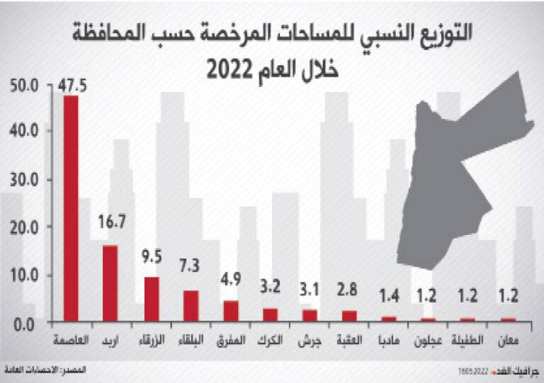 وبلغ إجمالي عدد رخص الأبنية الصادرة في المملكة 5.335 رخصة خلال الربع الأول من العام 2022، مقارنة مع 6.732 رخصة خلال الفترة نفسها من العام 2021، بانخفاض نسبته 20.8 %.