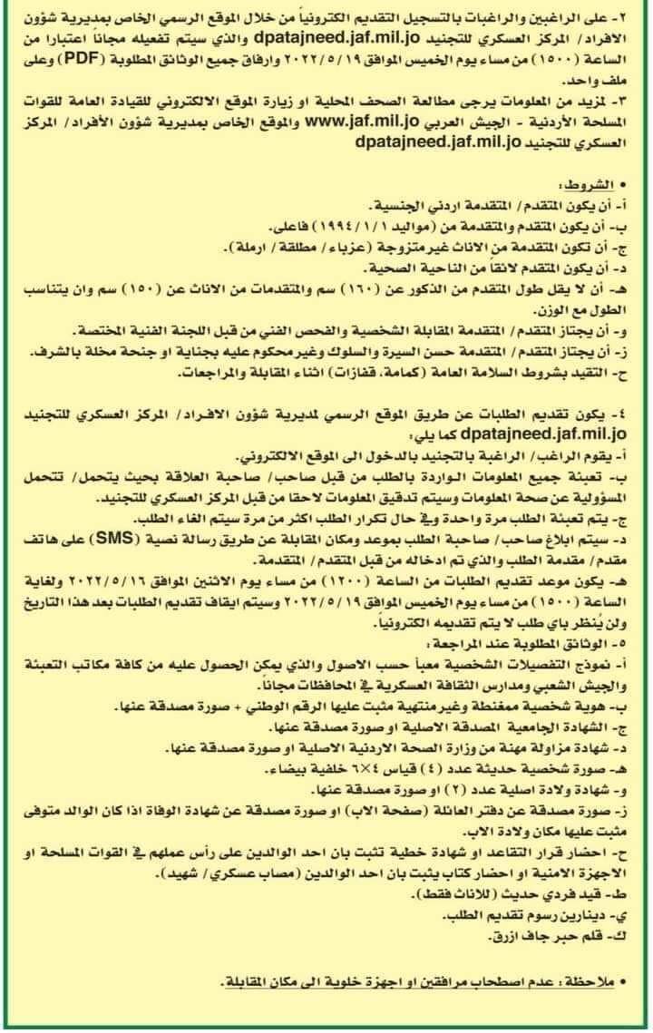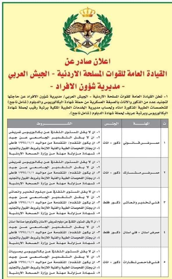 أعلنت القيادة العامة للقوات المسلحة الاردنية -الجيش العربي / مديرية شؤون الافراد عن حاجتها لتجنيد عدد من الذكوروالاناث بالصبغة العسكرية من حملة شهادة البكالوريوس والدبلوم (شامل ناجح) للتخصصات الطبية المذكورة ادناه ولحساب الخدمات الطبية الملكية برتبة رقيب  لحملة شهادة البكالوريوس وبرتبة عريف لحملة شهادة الدبلوم (شامل ناجح)