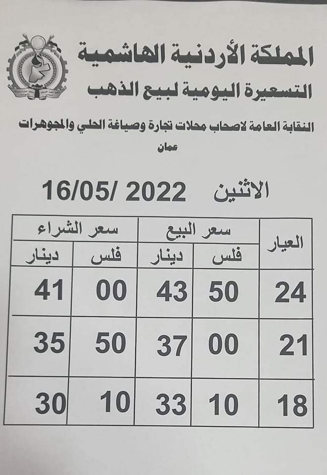 ويشمل التقريــر أسعار المعدن عيارات ( 24، 21، 18) ، كونها الأكثر تداولا في الأردن.