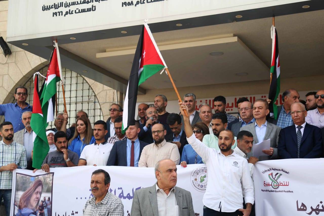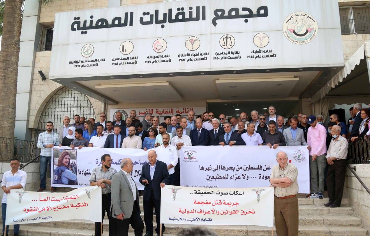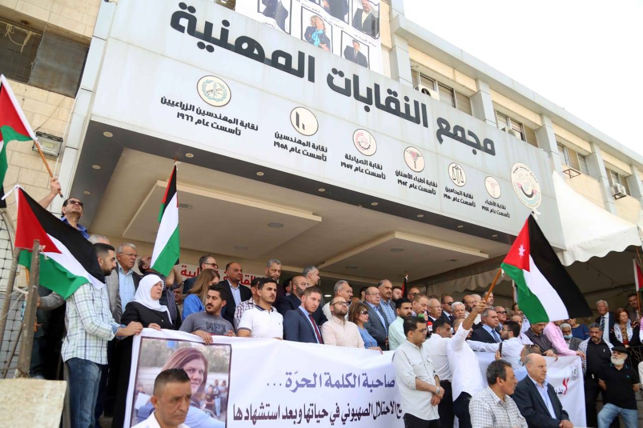 شاركت نقابة المهندسين الأردنيين في الوقفة التضامنية التي نظمها مجمع النقابات المهنية اليوم الاحد احياء لذكرى النكبة، وتنديدا باغتيال الصحفية شيرين أبو عاقلة.