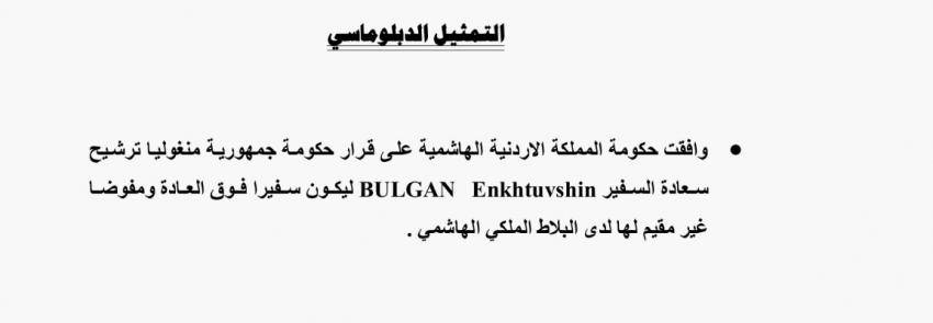 : وافقت الحكومة الأردنية على قرار حكومة جمهورية منغوليا ترشيح سفير جديد ليكون سفيرا فوق العادة ومفوضا غير مقيم لها لدى البلاط الملكي الهاشمي.