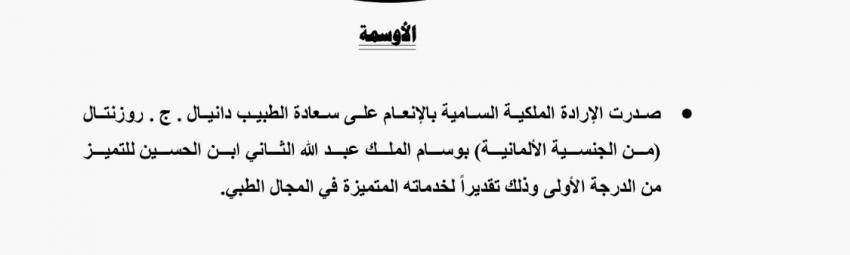 : صدر في عدد الجريدة الرسمية اليوم الاثنين الارادة الملكية السامية بالانعام على الطبيب دانيال روزنتال من الجنسية الألمانية بوسام الملك عبدالله الثاني ابن الحسين للتميز من الدرجة الأولى.