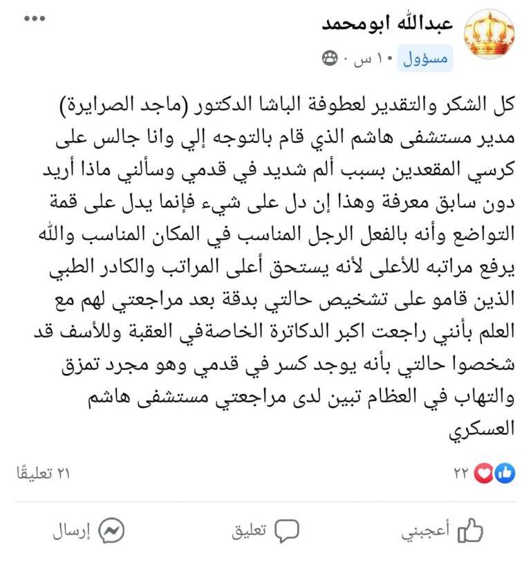 وجه المواطن عبدالله ابو محمد من سكان العقبة رسالة شكر وتقدير لمدير مستشفى الأمير هاشم العسكري بالعقبة عبر صفحته على الفيسبوك تاليا نصها :