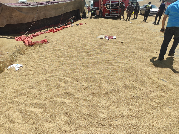 وبحسب الصور ، تقوم كوادر الدفاع المدني بالتعامل مع الحادثة في حين انهال محمول الشاحنة من القمح على الشارع العام ويجري ازالته .