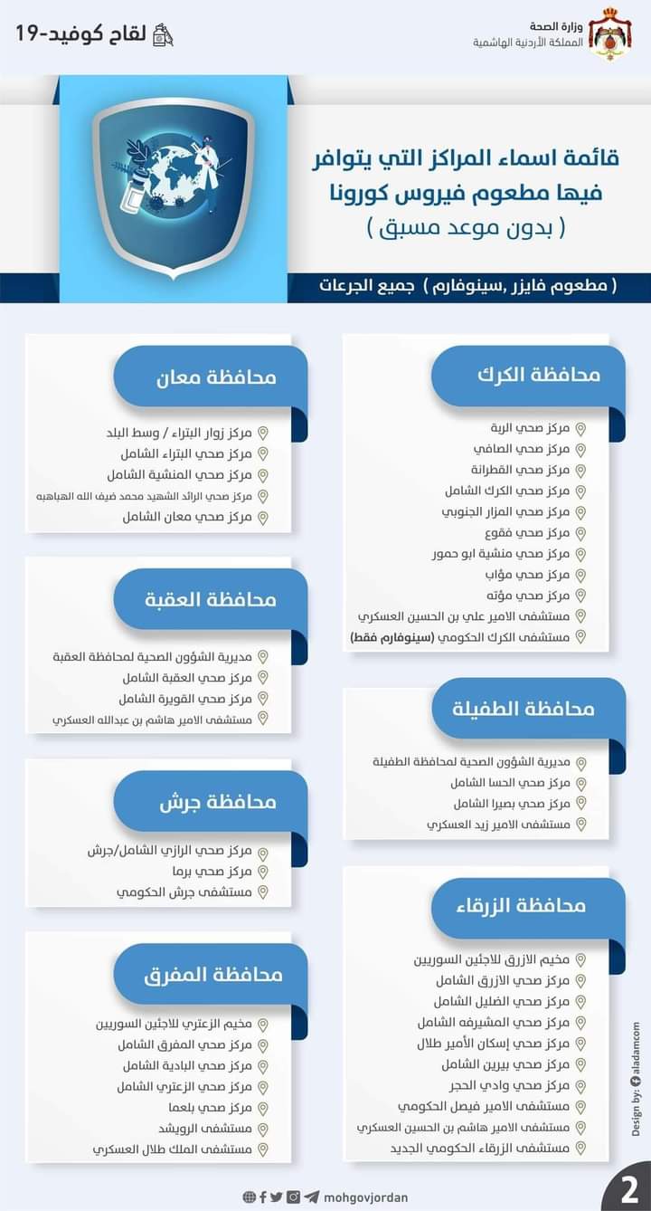 أعلنت وزارة الصحة عن قائمة اسماء المراكز التي يتوافر فيها مطعوم فيروس كورونا (بدون موعد مسبق) #جميع_الجرعات ليوم الاربعاء 2022/5/18 :