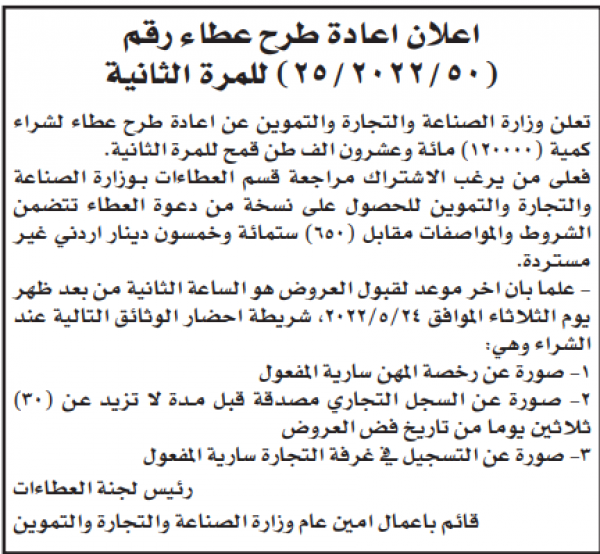 مطلوب شراء "120"الف طن قمح
