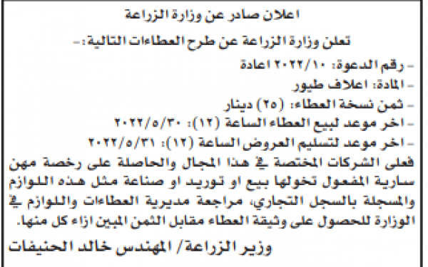 مطلوب شراء اعلاف طيور لوزارة الزراعة