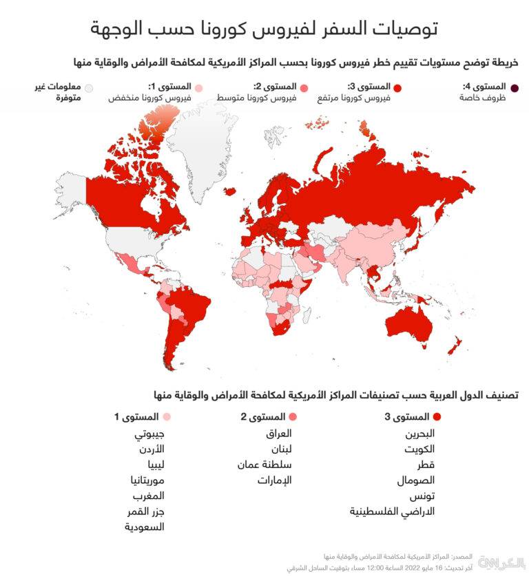 وأصبح المستوى الثالث يشمل الدول حيث خطر تفشي "كوفيد-19” "عالي الخطورة”، الذي لم تدرج ضمنه أي وجهة عربية إضافية، في تحديث الوكالة الأخير.