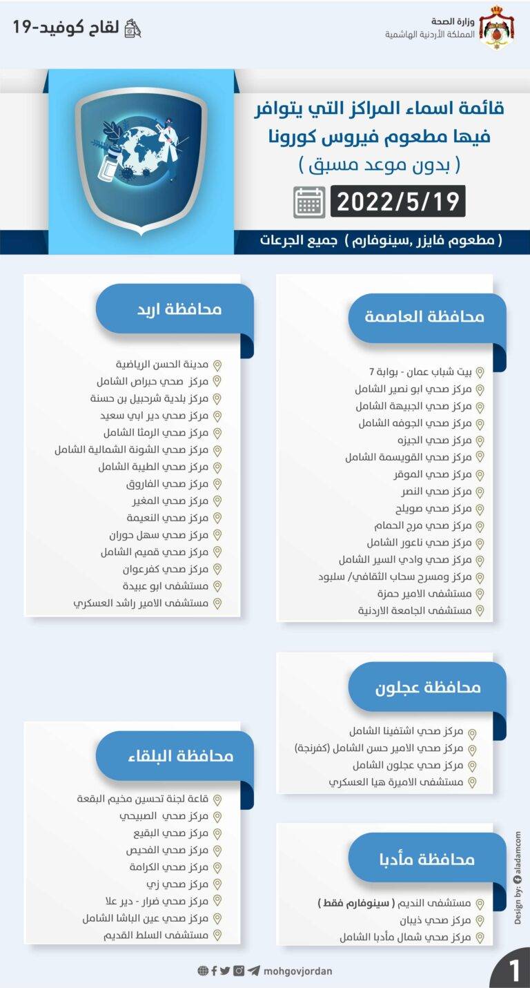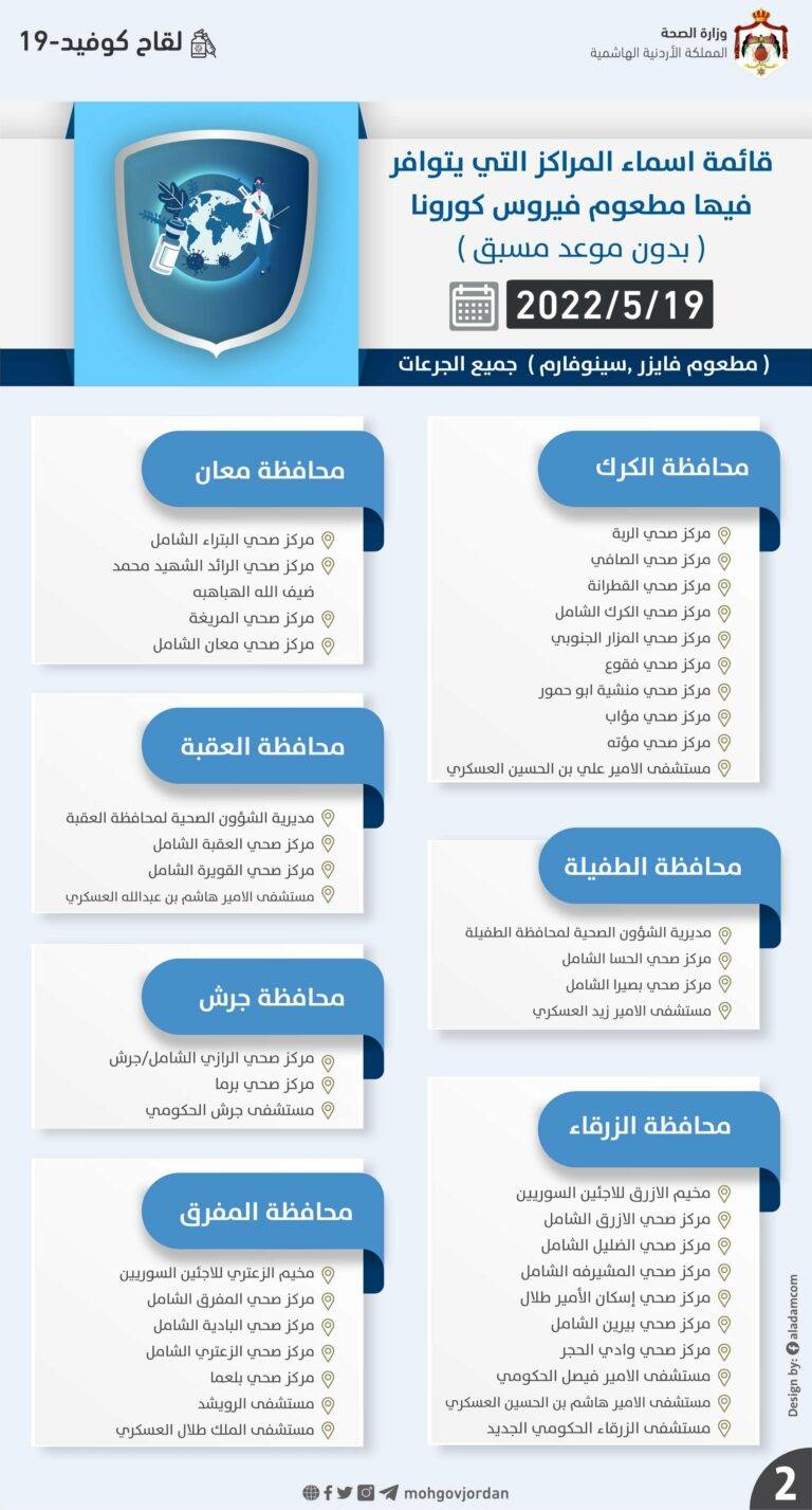 أعلنت وزارة الصحة قائمة أسماء المراكز التي يتوافر فيها مطعوم فيروس كورونا (بدون موعد مسبق) بجميع الجرعات ليوم الخميس 2022/5/19.