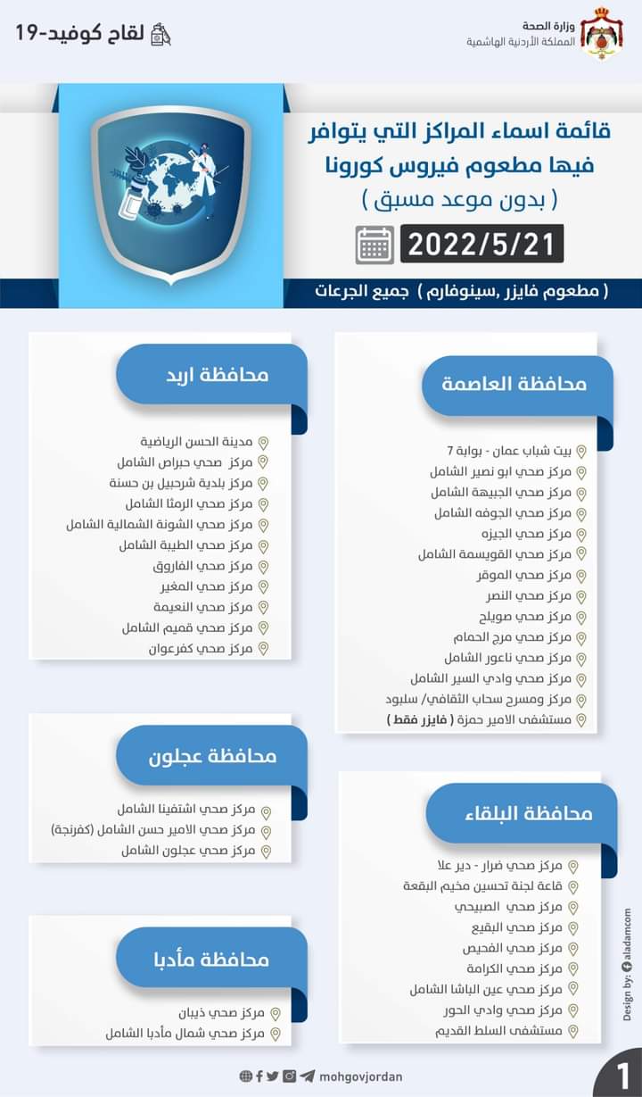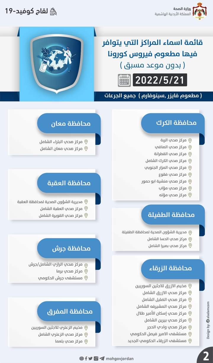 أعلنت وزارة الصحة عن قائمة اسماء المراكز التي يتوافر فيها مطعوم فيروس كورونا (بدون موعد مسبق) جميع_الجرعات ليوم السبت 2022/5/21: