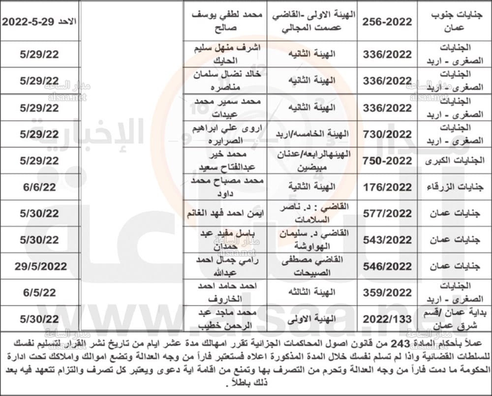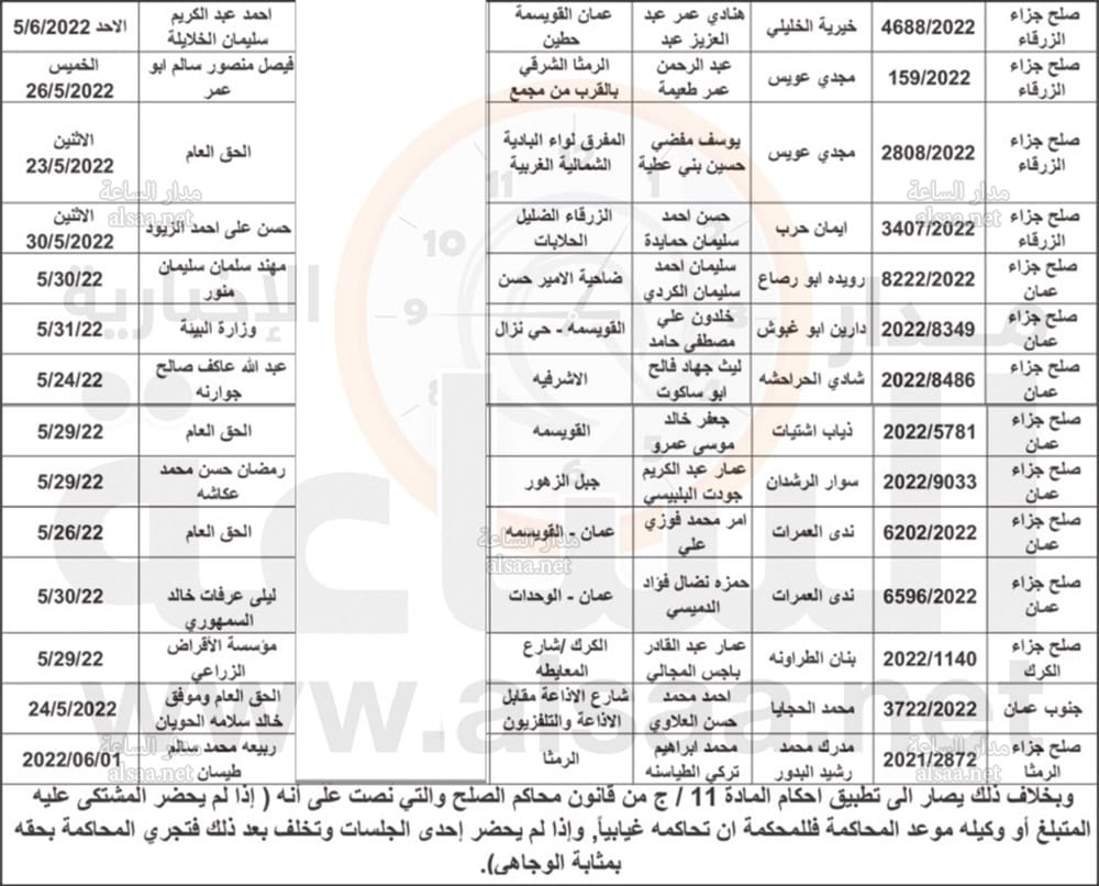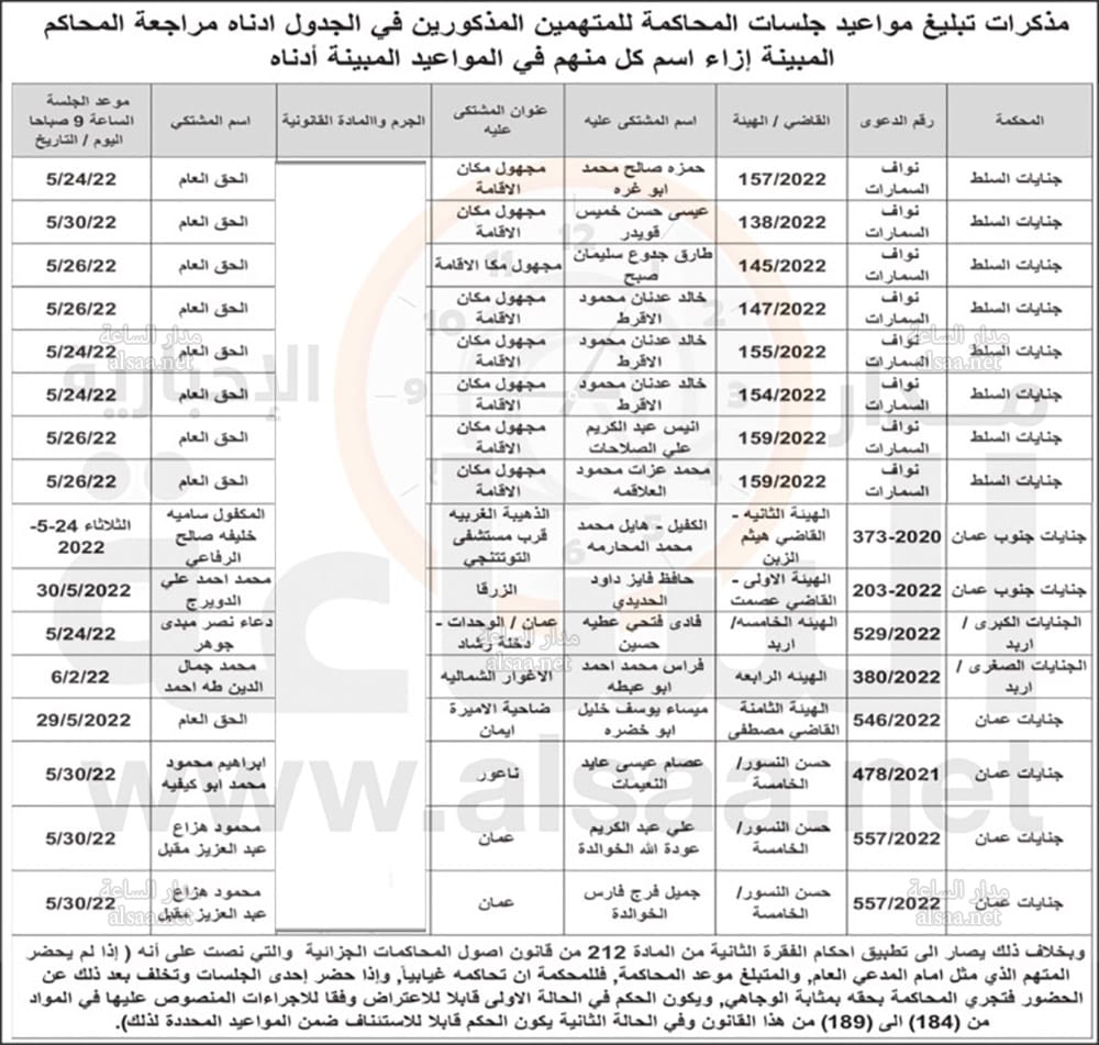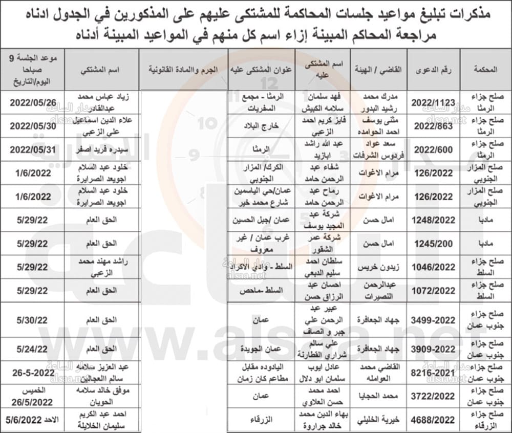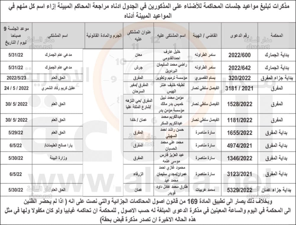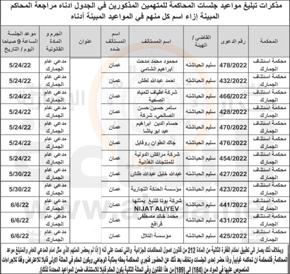 وطلبت المذكرات من المذكورين في الجداول أدناه مراجعة المحاكم المبينة ازاء اسم كل منهم في المواعيد المبينة أدناه.