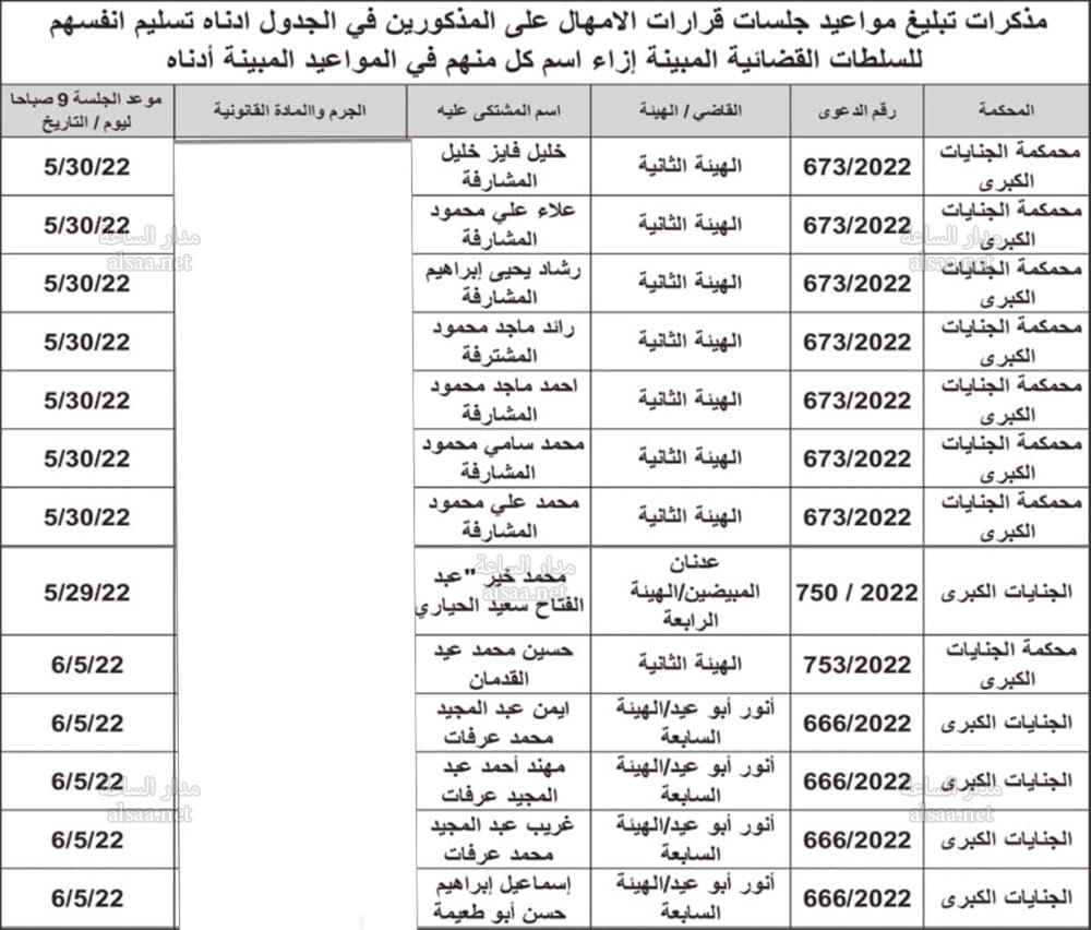 صدرت اليوم الاثنين مذكرات تبليغ مواعيد جلسات المحاكمة لمشتكى عليهم ولمتهمين ولأضناء وقرارات امهال.