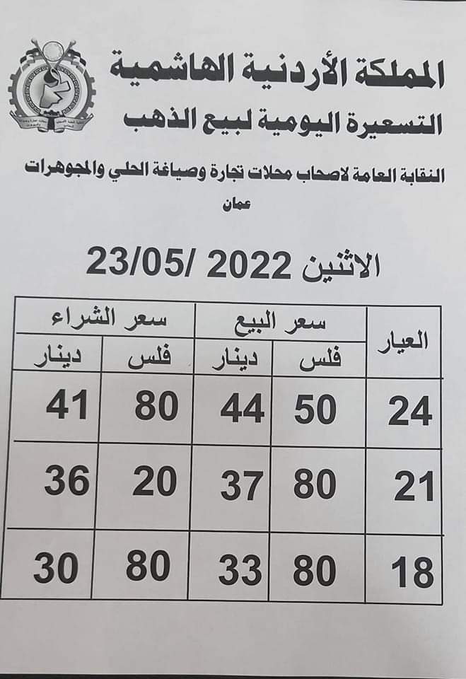ويشمل التقريــر أسعار المعدن عيارات ( 24، 21، 18) ، كونها الأكثر تداولا في الأردن.