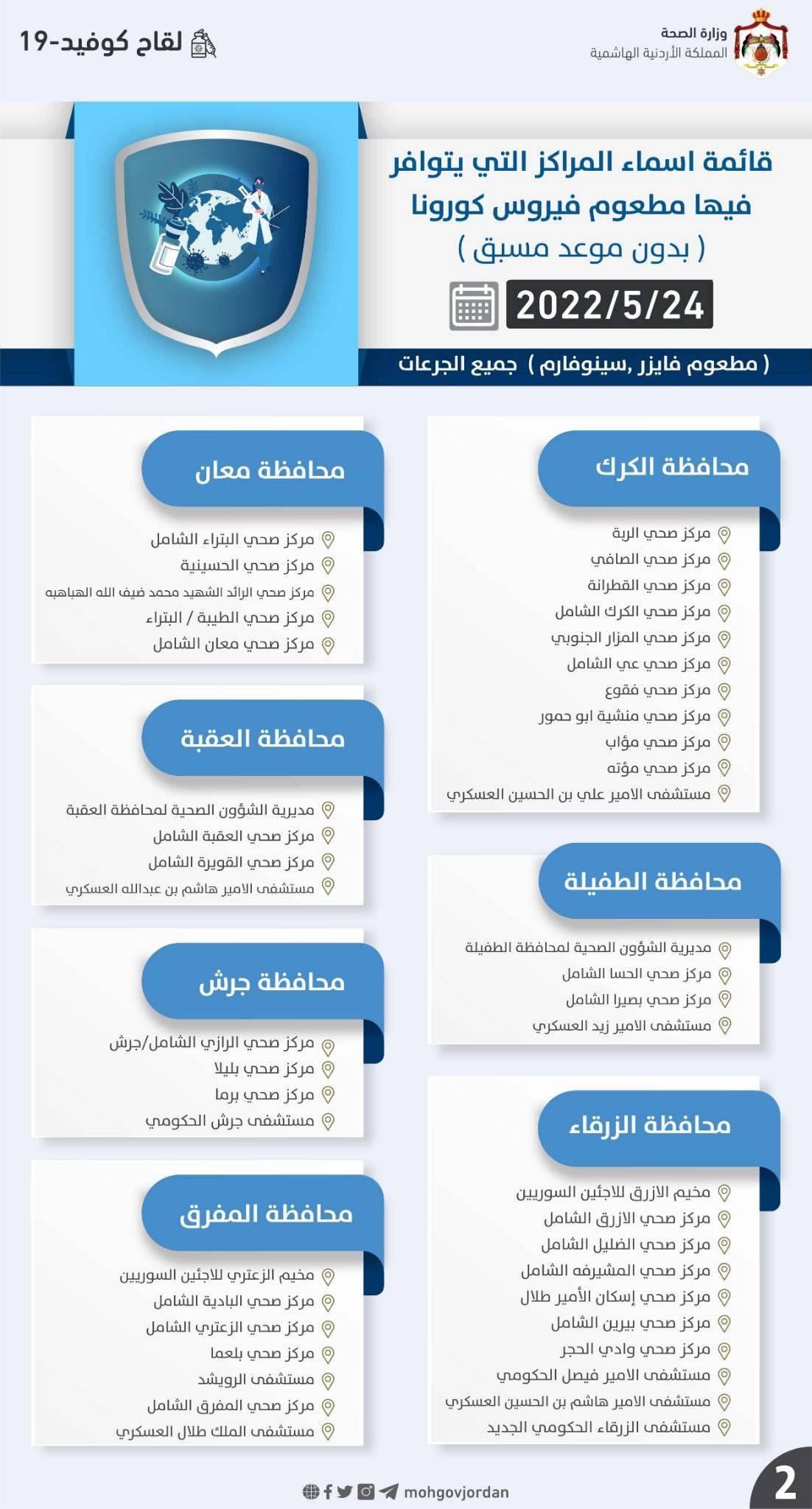 : أعلنت وزارة الصحة عن قائمة أسماء المراكز التي يتوافر فيها مطعوم فيروس كورونا (بدون موعد مسبق) بجميع الجرعات ليوم الثلاثاء.