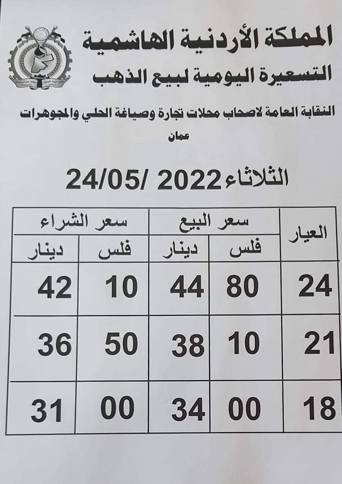 ويشمل التقريــر أسعار المعدن عيارات ( 24، 21، 18) ، كونها الأكثر تداولا في الأردن.