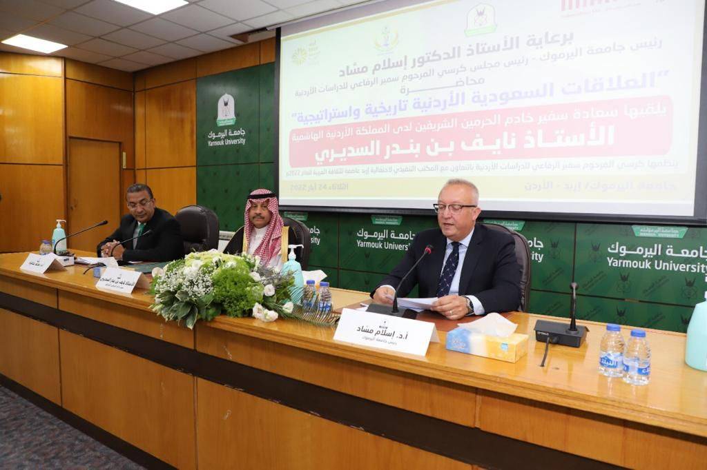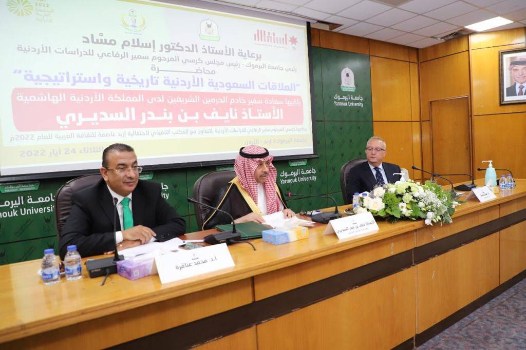 القى سفير خادم الحرمين الشريفين لدى الأردن نايف بن بندر السديري محاضرة اليوم نظمها كرسي المرحوم سمير الرفاعي للدراسات الأردنية في جامعة اليرموك ضمن فعاليات أربد عاصمة الثقافة العربية لعام 2022.