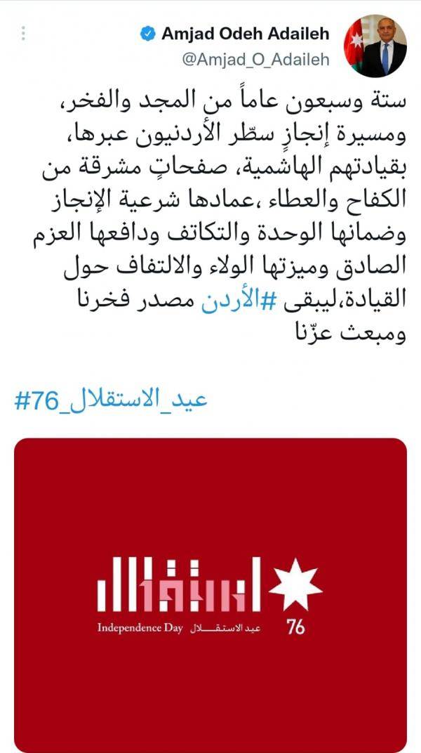 نيروز الإخبارية : كتب السفير الأردني في القاهرة أمجد العضايلة، بمناسبة العيد السادس والسبعين لاستقلال المملكة الأردنية الهاشمية، تغريدة اليوم الاربعاء، على حسابه الشخصي على موقع التواصل الاجتماعي تويتر قال فيها: "‏ستة وسبعون عاماً من المجد والفخر، ومسيرة إنجازٍ سطّر الأردنيون عبرها، بقيادتهم الهاشمية، صفحاتٍ مشرقة من الكفاح والعطاء ،عمادها شرعية الإنجاز وضمانها الوحدة والتكاتف ودافعها العزم الصادق وميزتها الولاء والالتفاف حول القيادة".