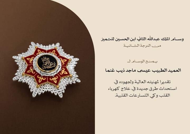 كما أنعم جلالته بوسام الملك عبدالله الثاني ابن الحسين للتميز من الدرجة الثانية، على العميد الطبيب عيسى ماجد غنما، تقديرا لمهنيته العالية ولجهوده في استحداث طرق جديدة في علاج كهرباء القلب وكي التسارعات القلبية.