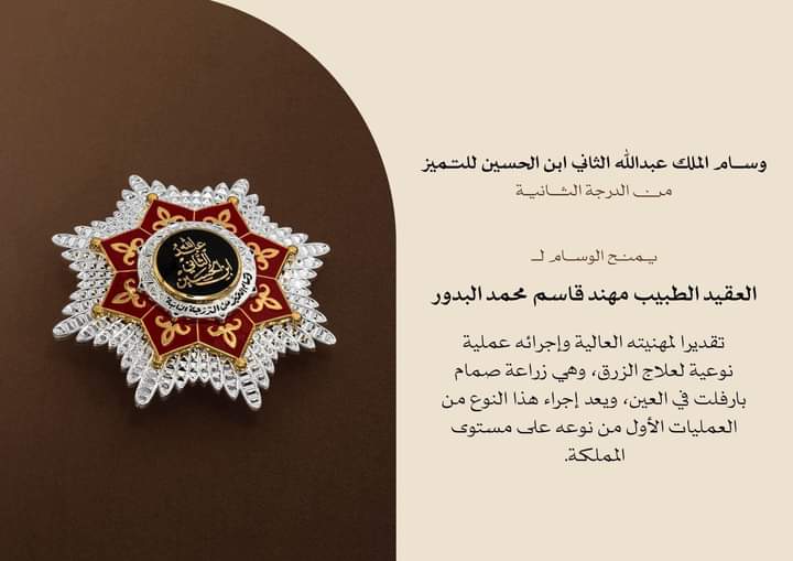 وأنعم جلالة الملك بوسام الملك عبدالله الثاني ابن الحسين للتميز من الدرجة الثانية على العقيد الطبيب مهند قاسم البدور، تقديرا لمهنيته العالية وإجرائه عملية نوعية لعلاج الزرق، وهي زراعة صمام بارفلت في العين، إذ يعد إجراء هذا النوع من العمليات الأول من نوعه على مستوى المملكة.