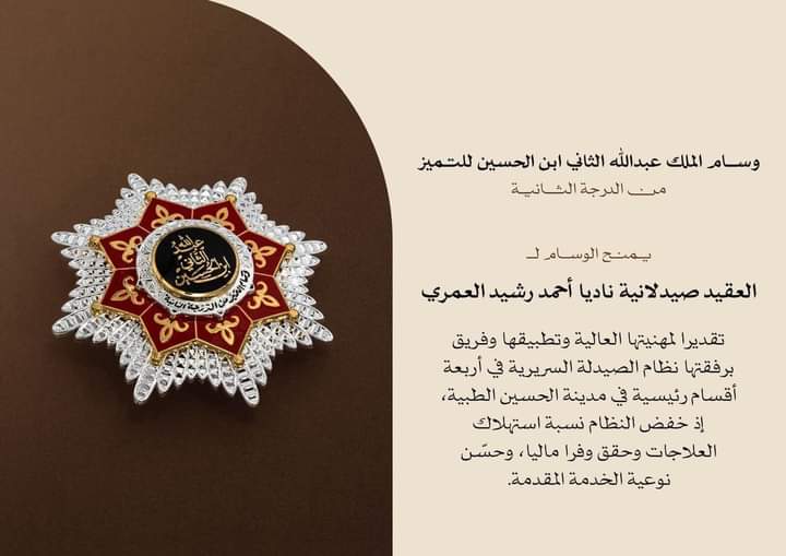 كما أنعم جلالته بوسام الملك عبدالله الثاني ابن الحسين للتميز من الدرجة الثانية على العقيد صيدلانية ناديا أحمد العمري، تقديرا لمهنيتها العالية وتطبيقها، وفريق برفقتها، نظام الصيدلة السريرية في أربعة أقسام رئيسية في مدينة الحسين الطبية، إذ خفض النظام نسبة استهلاك العلاجات وحقق وفرا ماليا وحسّن نوعية الخدمة المقدمة.