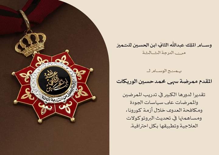 كما أنعم جلالته بوسام الملك عبدالله الثاني ابن الحسين للتميز من الدرجة الثالثة على المقدم ممرضة سهى محمد الوريكات، تقديرا لدورها الكبير في تدريب الممرضين والممرضات على سياسات الجودة ومكافحة العدوى خلال أزمة كورونا، ومساهمتها في تحديث البروتوكولات العلاجية وتطبيقها بكل احترافية.