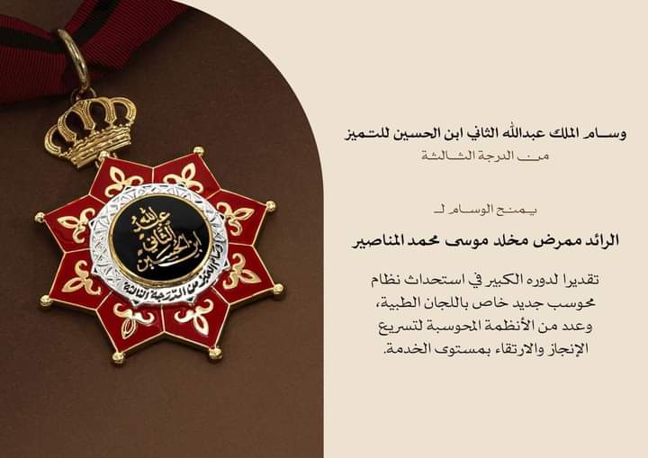 كما أنعم جلالته بوسام الملك عبدالله الثاني ابن الحسين للتميز من الدرجة الثالثة على الرائد ممرض مخلد موسى المناصير، تقديرا لدوره الكبير في استحداث نظام محوسب جديد خاص باللجان الطبية، وعدد من الأنظمة المحوسبة لتسريع الإنجاز والارتقاء بمستوى الخدمة.