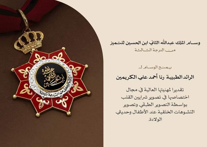 وأنعم جلالة الملك بوسام الملك عبدالله الثاني ابن الحسين للتميز من الدرجة الثالثة على الرائد الطبيبة رنا أحمد الكريمين، تقديرا لمهنيتها العالية في مجال اختصاصها في تصوير شرايين القلب بواسطة التصوير الطبقي وتصوير التشوهات الخلقية عند الأطفال وحديثي الولادة.