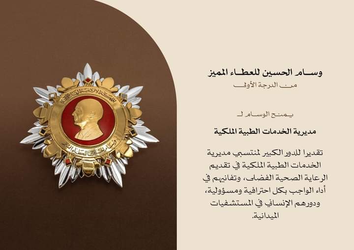 وخلال الاحتفال أنعم جلالته بوسام الحسين للعطاء المميز من الدرجة الأولى، على مديرية الخدمات الطبية الملكية، تقديرا للدور الكبير لمنتسبي المديرية في تقديم الرعاية الصحية الفضلى، وتفانيهم في أداء الواجب بكل احترافية ومسؤولية، ودورهم الإنساني في المستشفيات الميدانية .