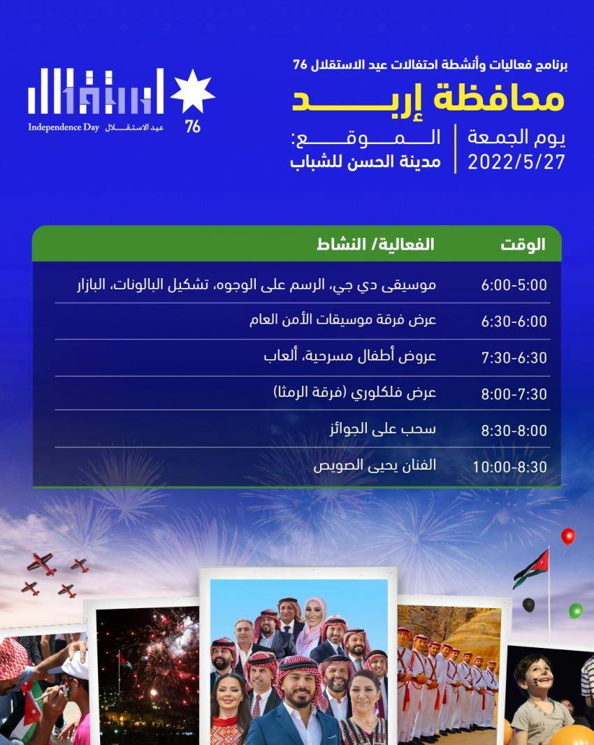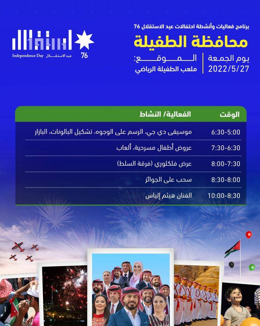تتواصل فعاليات الاحتفال بعيد استقلال المملكة الأردنية الهاشمية الـ76، لليوم الثالث على التوالي، في جميع محافظات المملكة.