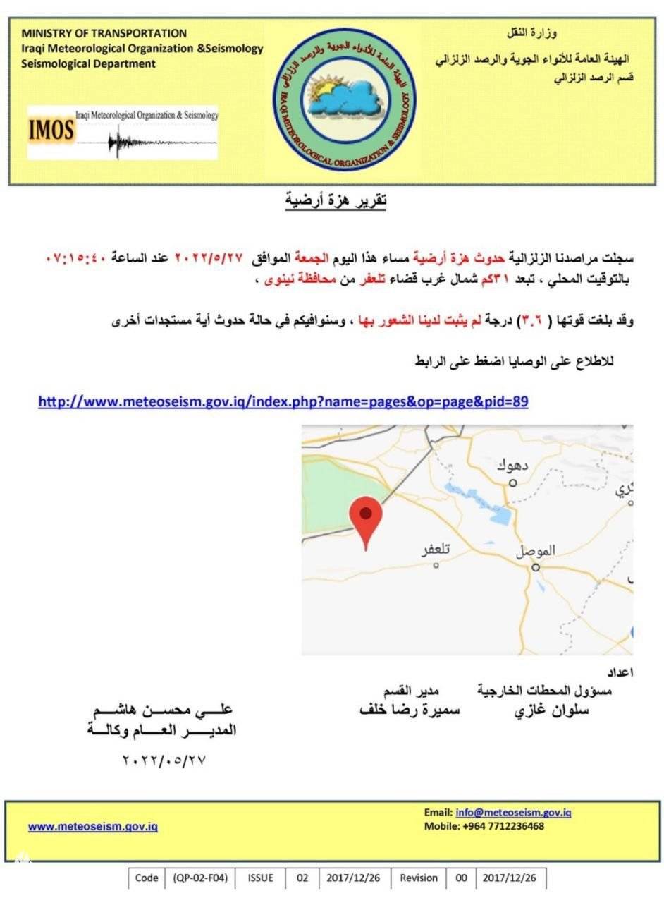 أعلنت هيئة الأنواء الجوية إحدى تشكيلات وزارة النقل، اليوم الجمعة، تسجيل هزة أرضية بقوة( 3،6) درجة على مقياس رختر شمال غرب قضاء  تلعفر.