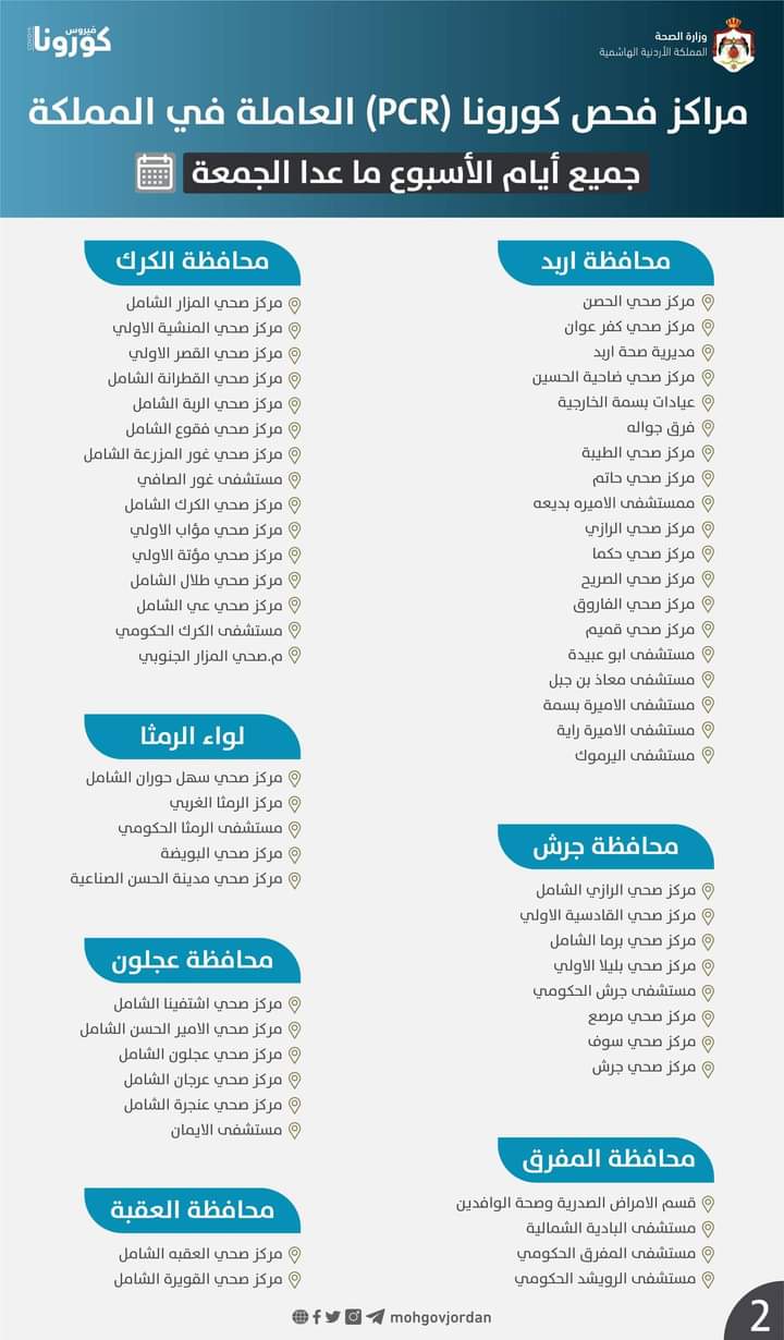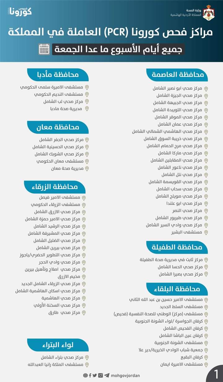 مراكز فحص كورونا (PCR) العاملة طيلة أيام الأسبوع ما عدا يوم الجمعة