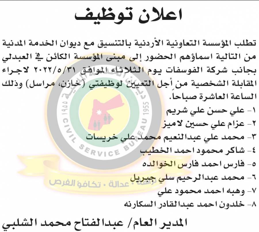 دعا ديوان الخدمة المدنية بالتعاون مع مختلف الوزارات والمؤسسات الحكومية، التالية اسماؤهم لاجراء المقابلات الشخصية وعقد الامتحان التنافسي لغايات التعيين.