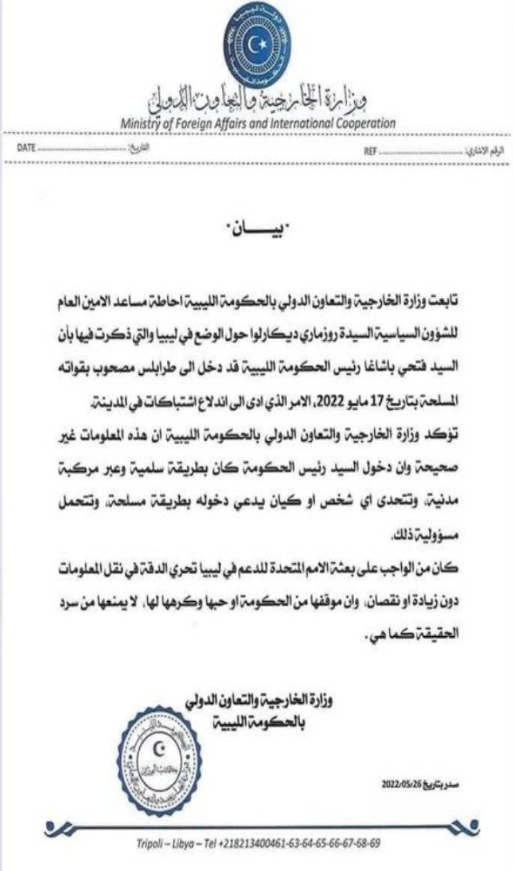 يذكر أن مساعد الأمين العام للشؤون السياسية "روزماري ديكارلوا"، قد تطرقت أمس السبت في كلمة لها في مجلس الأمن عن الوضع في ليبيا ودخول باشاغا إلى طرابلس.