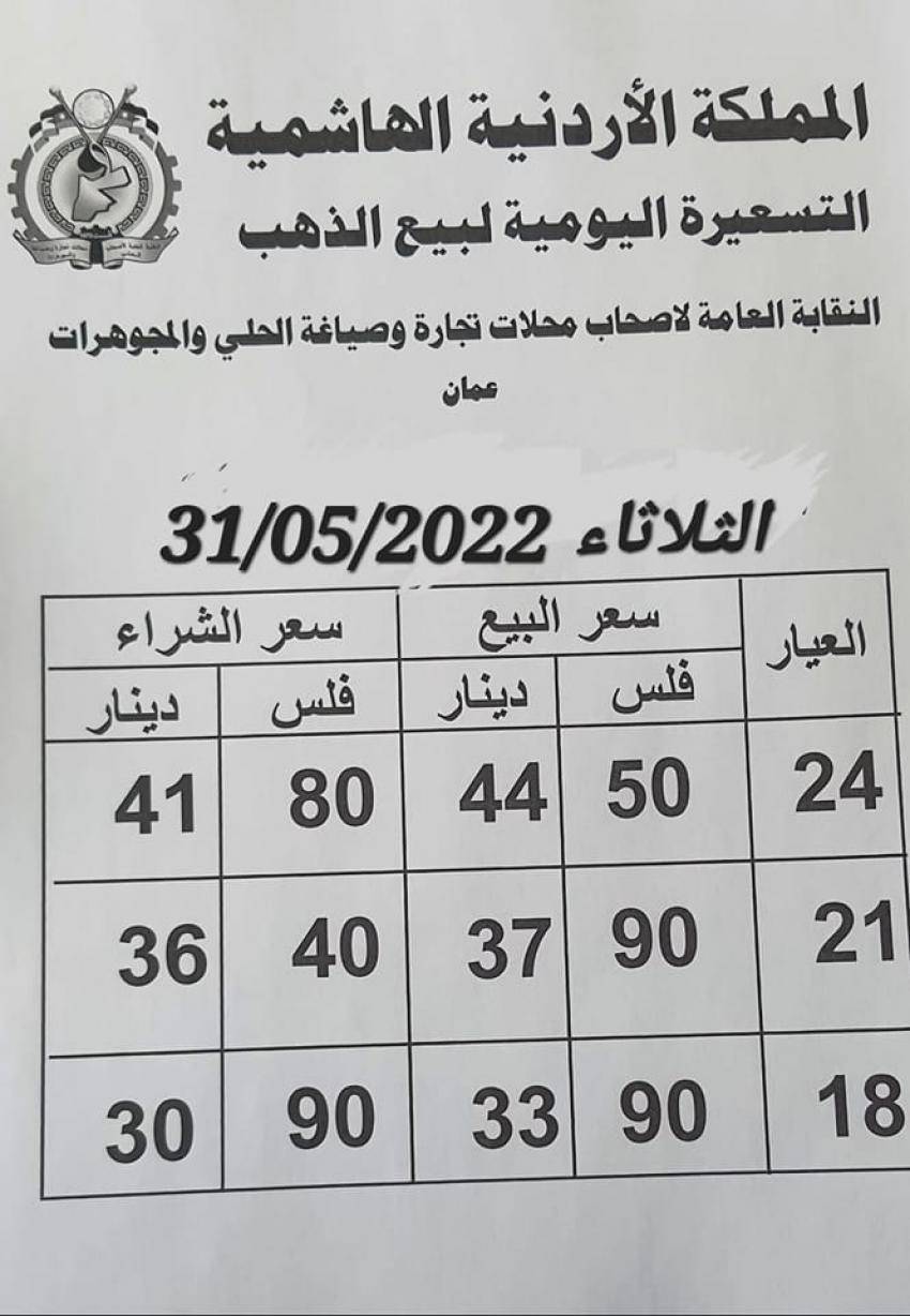 اسعار الذهب في الأردن الثلاثاء