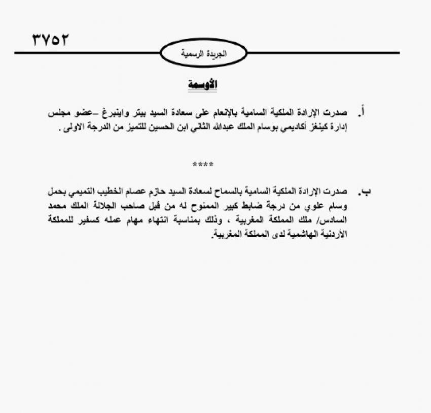 كما صدرت الارادة الملكية السامية بالسماح لحازم عصام الخطيب التميمي بحمل وسام علوي من درجة ضابط كبير الممنوح له من قبل ملك المغرب وذلك بمناسبة انتهاء عمله كسفير للمملكة الأردنية الهاشمية لدى المملكة المغربية.