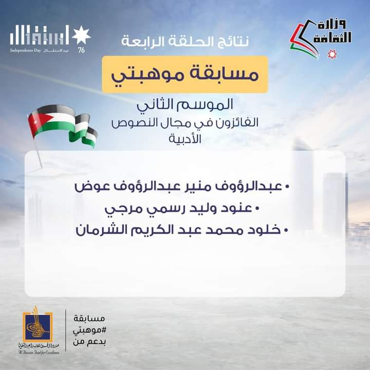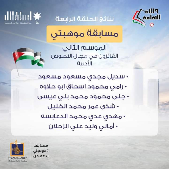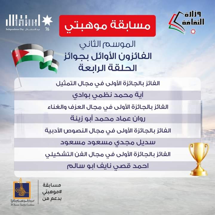 وزارة الثقافه تنشر أسماء الفائزين بجوائز الحلقة الرابعة والأخيرة من مسابقة موهبتي / الموسم الثاني 2022