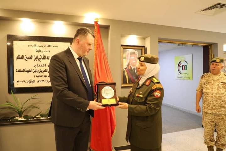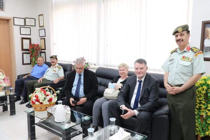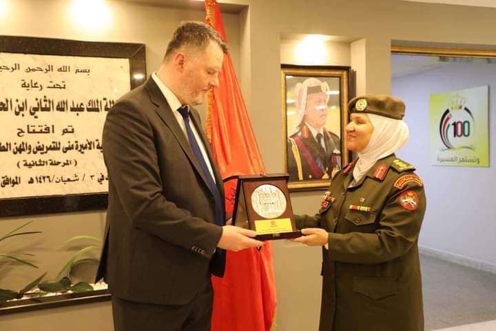 كما قام الوفد الضيف بزيارة لكلية الأميرة منى للتمريض وكان في استقبالهم  عميدة الكلية العقيد الطبيب خلود مطر  وقدمت إيجازا عن نشأة وتاسيس الكلية واقسامها المختلفة والية عملها، واساليب تدريب الممرضات القانونيات العسكريات بكل حرفية ومهارة عالية .