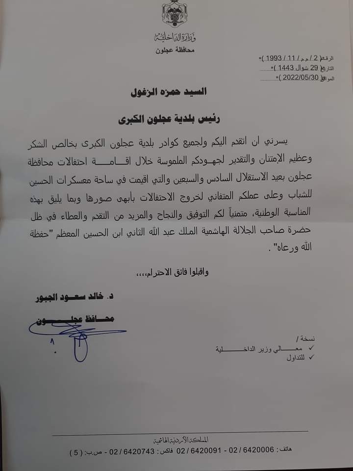 وجه محافظ عجلون الدكتور خالد الجبور كتاب شكر وتقدير لرئيس بلدية عجلون الكبرى حمزه الزغول وجميع موظفيها وكوادرها العاملة  .