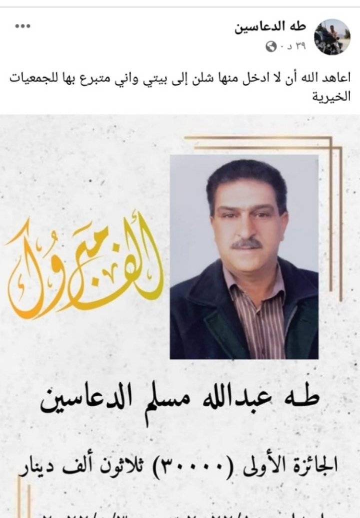 تعهّد مواطن أردني، خلال منشور عبر صفحته على الفيس بوك، بالتبرع بكامل جائزة اليانصيب التي نالها والمقدرة بـ 30 ألف دينار للجمعيات الخيرية.