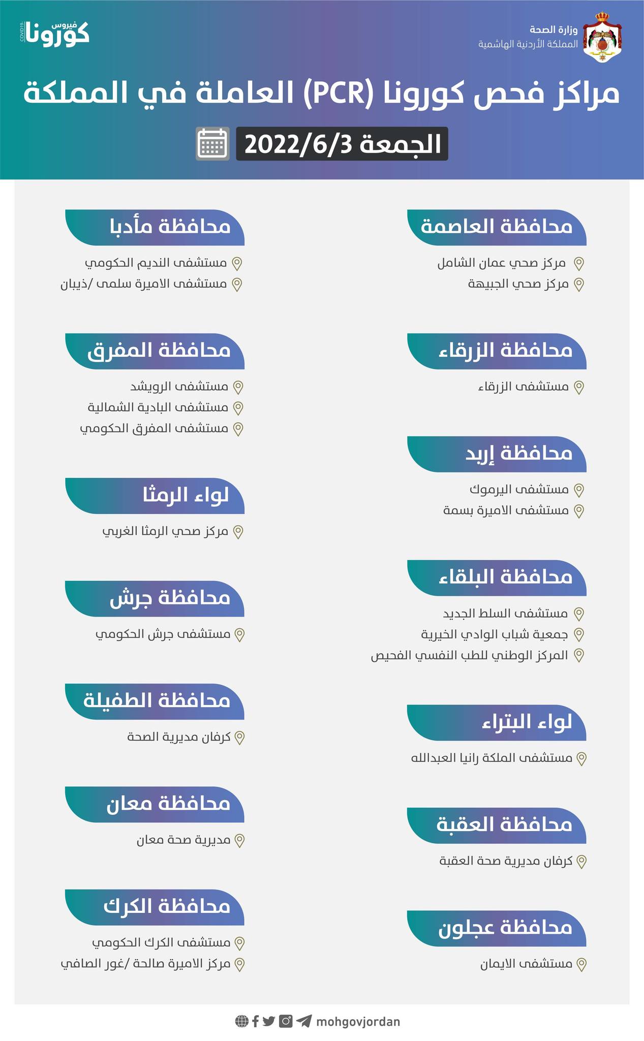 أعلنت وزارة الصحة عن أسماء مراكز فحص كورونا (PCR) العاملة يوم الجمعة، منوهة بأن دوامها سيكون من الساعة الـ9:00 صباحاً وحتى الـ2:00 مساء.